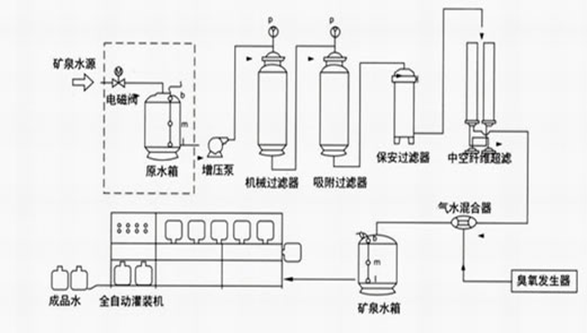 2.礦泉水的常規(guī)生產(chǎn)流程為:水源-增壓泵-石英砂過(guò)濾器-活性炭過(guò)濾器-精密過(guò)濾器-超濾主機(jī)-臭氧消毒-儲(chǔ)水罐-灌裝機(jī)-包裝車(chē)間